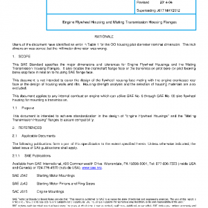 This SAE Standard specifies the major dimensions and tolerances for Engine Flywheel Housings and the Mating Transmission Housing Flanges. It also locates the crankshaft flange face or the transmission pilot bore (or pilot bearing bore) stop face in relation to housing SAE flange face.
