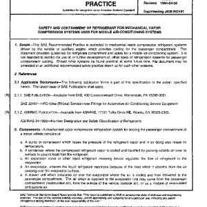 This SAE Recommended Practice is restricted to mechanical vapor compression refrigerant systems driven by the vehicle or auxiliary engine, which provides cooling for the passenger compartment. This document provides guidelines for refrigerant containment and safety for a mobile air-conditioning system. It is not intended to restrict the use of, or further development of, other types of refrigeration systems for passenger compartment cooling. Should other systems be found practical at some future time, this document may be amended or an additional recommended safety practice drawn up for such other systems.