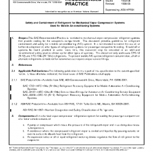 This SAE Recommended Practice is restricted to mechanical vapor compression refrigerant systems that provide cooling for the occupant’s compartment. This document provides guidelines for refrigerant containment and safety for a mobile air-conditioning (A/C) system. It is not intended to restrict the use of, or further development of, other types of refrigeration systems for passenger compartment cooling. Should other systems be found practical at some future time, this document may be amended or an additional recommended safety practice drawn up for other types of systems. This document only addresses CFC-12 (R-12) and HFC-134a (R-134a) refrigerants. To prevent mobile A/C system refrigerant contamination, all other alternate refrigerants considered for automotive use require unique service fittings.