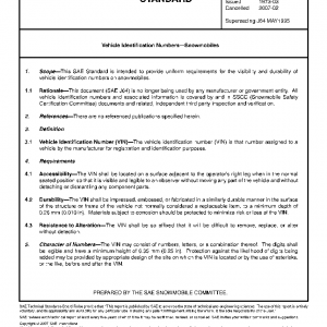 This SAE Standard is intended to provide uniform requirements for the visibility and durability of vehicle identification numbers on snowmobiles.