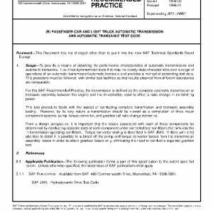 To provide a means of obtaining the performance characteristics of automatic transmissions and automatic transaxles. It outlines dynamometer tests that map the steady-state characteristics over a range of operations of an automatic transmission/automatic transaxle and provides a method of presenting test data. This procedure must be followed, with similar test facilities so that results obtained from different laboratories are comparable.