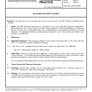 This SAE Recommended Practice is intended to cover current safety glazing practice applicable to safety glasses for use in motor vehicles and motor vehicle equipment. Nominal specifications for thickness, flatness, curvature, size, and fabrication details are included principally for the guidance of body engineers and designers. For additional information on safety glazing materials for use in motor vehicles and motor vehicle equipment, see SAE J674.