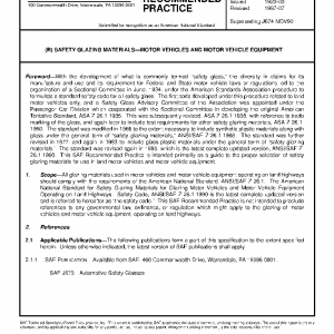 All glazing materials used in motor vehicles and motor vehicle equipment operating on land highways should comply with the requirements of the American National Standard, ANSI/SAE Z-26.1. The American National Standard for Safety Glazing Materials for Glazing Motor Vehicles and Motor Vehicle Equipment Operating on Land Highways—Safety Code, ANSI/SAE Z-26.1-1990 is the latest complete updated version and is referred to hereafter as “the safety code.” This SAE Recommended Practice is not intended to preclude references to any governmental law, ordinance, or regulation which might apply to the glazing of motor vehicles and motor vehicle equipment operating on land highways.