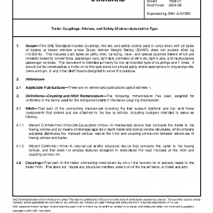 This SAE Standard includes couplings, hitches, and safety chains used in conjunction with all types of trailers or towed vehicles whose Gross Vehicle Weight Rating (GVWR) does not exceed 4540 kg (10 000 lb). This includes such types as utility, boat, camping, travel, and special purpose trailers which are normally towed by conventional passenger cars, light-duty commercial vehicles, light trucks, and multipurpose passenger vehicles. This document is intended primarily for ball-and-socket type of couplings and hitches. It should not be construed as a limitation to this type alone but should apply where appropriate to ring-and-pintle, clevis-and-pin, or any other draft means designed to serve this purpose.