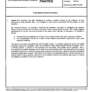 The procedure has been developed to provide a practical method for the prediction of truck performance using accepted data. It Is designed to help anyone concerned with the problem of truck selection.By following directions, it is possible to determine the necessary information for intelligent truck selection without being concerned with the origin or derivation of the complex factors involved. With readily available specification of a truck, information provided in the tables, and minimum of calculation, it is possible to predict:(a) The performance obtainable from a truck of given characteristics under given operating conditions. (b) The characteristics required in a truck to meet different performance requirements under given operating conditions.This report comprises a procedure form and 10 tables of data. A complete explanation of the truck ability prediction procedure is contained in SAE Technical Report HS-82, Truck Ability Prediction Procedure.ty prediction procedure is contained in SAE Technical Report HS-82, Truck Ability Prediction Procedure. Part 1 of HS-82 contains, in addition to the procedure form and tables, work sheets ans an example. Part 2 demonstrates by practical examples how to obtain some of the answers other than grade ability, and presents a detailed procedure for computing instantaneous acceleration and the time or distance required to accelerate between specified limits of speed. Part 3 gives terminology, the fundamental relations, and the formulas which form the basis for the procedure, a discussion of th reliability of factors and methods, and presents a method for evaluating the effect of wind on air resistance.