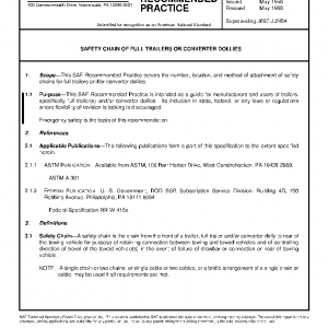 This SAE Recommended Practice covers the number, location, and method of attachment of safety chains for full trailers and/or converter dollies.
