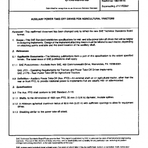 This SAE Standard establishes specifications for mid- and side-power take-off drives that will be helpful in designing implements. Design of the implement attaching means must be tailored to each tractor, depending on attaching points available and the exact location of the auxiliary shaft.