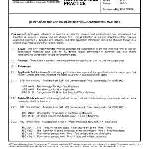 This SAE Recommended Practice describes the classification of off-road tires and rims for use on construction machines (see SAE J1116), defines related terminology in common use, and shows representative construction details of component parts.