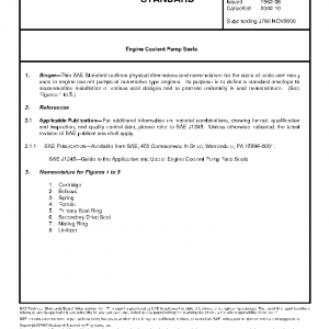 This SAE Standard outlines physical dimensions and nomenclature for the sizes of seals commonly used in engine coolant pumps of automotive type engines. Its purpose is to define a standard envelope to accommodate installation of various seal designs and to promote uniformity in seal nomenclature. (See Figures 1 to 5.)