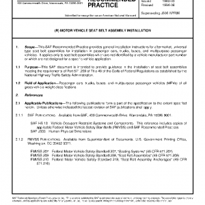 This SAE Recommended Practice provides general installation instructions for aftermarket, universal type seat belt assemblies for installation in passenger cars, trucks, buses, and multipurpose passenger vehicles. It applies only to seat belt assemblies which are not identified by a vehicle manufacturer part number or which are not designed for a specific vehicle application.
