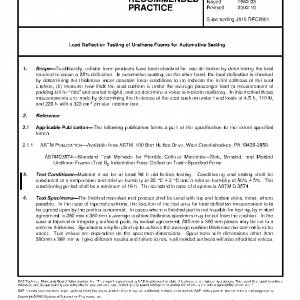Traditionally, cellular foam products have been checked for load deflection by determining the load required to cause a 25% deflection. In automotive seating, on the other hand, the load deflection is checked by determining the thickness under constant force conditions to (a) indicate the initial softness of the seat cushion, (b) measure how thick the seat cushion is under the average passenger load (a measurement of padding left for “ride” and seated height), and (c) determine a value to indicate resiliency. In this method these measurements are made by determining the thickness of the seat cushion under fixed loads of 4.5 N, 110 N, and 220 N with a 323 cm 2 circular indentor foot.
