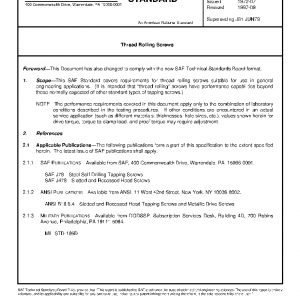 This SAE Standard covers requirements for thread rolling screws suitable for use in general engineering applications. (It is intended that “thread rolling” screws have performance capabilities beyond those normally expected of other standard types of tapping screws.)