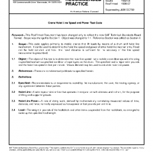 This code applies primarily to mobile cranes that lift loads by means of a drum and hoist line mechanism. It can be used to determine the hoist line speed and power of other hoist line mechanisms, if load can be held constant and hoist line travel distance is sufficient for the accuracy of the line speed measurements prescribed.