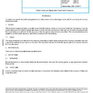 This document applies primarily to mobile cranes that lift loads by means of a drum and hoist line mechanism. It can be used to determine the hoist line speed and power of other hoist line mechanisms if the load can be held constant and hoist line travel distance is sufficient for the accuracy of the line speed measurements prescribed. This recommended practice applies to all mechanical, hydraulic, and electric powered hoist mechanisms.