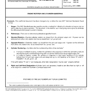 This SAE Standard was developed to provide a method for indicating the direction of engine rotation and numbering of engine cylinders. The document is intended for use in designing new engines to eliminate the differences which presently exist in industry.