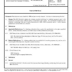 This SAE Standard contains the industry standard definitions for electrical equipment used in the generation of electric power onboard today’s conventional road vehicles. It is intended to complement the electronic terminology that was formerly documented in SAE J1213 (canceled) and/or in other industry glossaries of electrical/electronic devices.