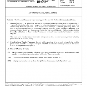 This report is an abbreviated summary of metallurgical joining by welding, brazing, and soldering. It is generally intended to reflect current usage in the automotive industry; however, it does include some of the more recently developed processes. More comprehensive coverage of materials, processing details, and equipment required may be found in the Welding Handbook, Soldering Manual, and other publications of the American Welding Society and the American Society for Testing and Materials. AWS Automotive Welding Committee publications on Recommended Practices are particularly recommended for the design or product engineer.