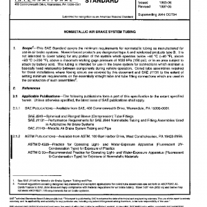 This SAE Standard covers the minimum requirements for nonmetallic tubing as manufactured for use in air brake systems. Nonreinforced products are designated type A and reinforced products type B. It is not intended to cover tubing for any portion of the system which operates below −40 °C (−40 °F), above +93 °C (+200 °F), above a maximum working gage pressure of 1030 kPa (150 psi), or in an area subject to attack by battery acid. This tubing is intended for use in the brake system for connections which maintain a basically fixed relationship between components during vehicle operation. Coiled tube assemblies required for those installations where flexing occurs are covered by this document and SAE J1131 to the extent of setting minimum requirements on the essentially straight tube and tube fitting connections which are used in the construction of such assemblies2.