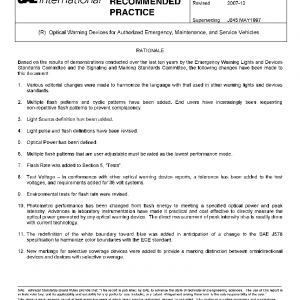 This document provides design guidelines, test procedure references, and performance requirements for omnidirectional and selective coverage, single color, optical warning devices used on authorized emergency, maintenance and service vehicles. It is intended to apply to, but not limited to, surface land vehicles.