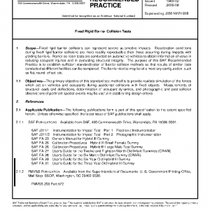Fixed rigid barrier collisions can represent severe automotive impacts. Deceleration conditions during fixed rigid barrier collisions are more readily reproducible than those occurring during impacts with yielding barriers. Barrier collision tests are conducted on automotive vehicles to obtain information of value in reducing occupant injuries and in evaluating structural integrity. The purpose of this SAE Recommended Practice is to establish sufficient standardization of barrier collision methods so that results of similar tests conducted at different facilities can be compared. The barrier device may be of almost any configuration, such as flat, round, offset, etc.