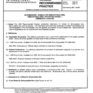 This SAE Recommended Practice establishes dimensions for wheels for demountable rims, demountable rims, and rim spacers. The dimensions given are those necessary to maintain serviceability and interchangeability of the demountable rims, rim spacers, and wheels for demountable rims. Special and less common applications are not covered in this recommended practice.