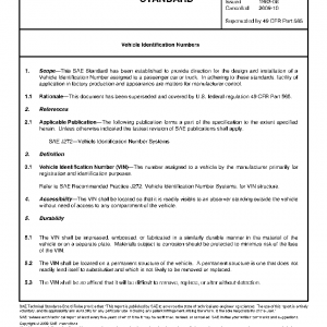 This SAE Standard has been established to provide direction for the design and installation of a Vehicle Identification Number assigned to a passenger car or truck. In adhering to these standards, facility of application in factory production and appearance are matters for manufacturer control.