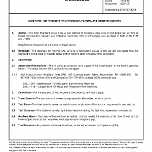 This SAE Standard establishes a test method to measure drag force of self-propelled, as well as towed, construction, forestry, and industrial machines, with or without payload, as listed in SAE J/ISO 6165 and J1116.