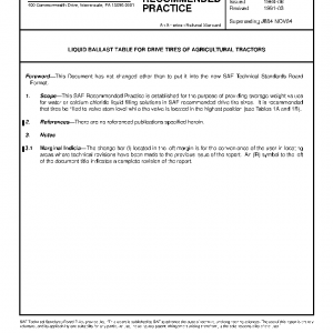 This SAE Recommended Practice is established for the purpose of providing average weight values for water or calcium chloride liquid filling solutions in SAE recommended drive tire sizes. It is recommended that tires be filled to valve stem level while the valve is located in the highest position (see Tables 1A and 1B).