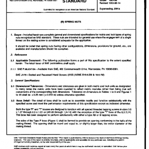 Included herein are complete general and dimensional specifications for metric and inch types of spring nuts recognized as SAE standard. These nuts are intended for general use where the engagement of a single thread on the mating screw is considered adequate for the application.