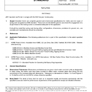 Included herein are complete general and dimensional specifications for metric and inch types of spring nuts recognized as SAE standard. These nuts are intended for general use where the engagement of a single thread on the mating screw is considered adequate for the application.