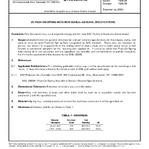Included herein are general, dimensional, and performance specifications for those types, styles, and sizes of steel stamped Push-On Spring Nuts recognized as SAE standard. These nuts are intended for general use where the engagement on the mating metal or plastic studs and in some cases screw or bolt threads is considered adequate for the fastening joint application. It should be noted that Push-On Spring Nuts having other characteristics and configurations are available and manufacturers should be consulted. For the metric equivalent of this document, see SAE J892M.
