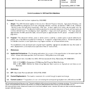 This SAE Standard applies to Construction, General Purpose Industrial, Agricultural, Forestry, and Specialized Mining categories of off-road, self-propelled work machines, as defined in SAE J1116. Powered industrial trucks and agricultural equipment, other than the basic agricultural tractor, are excluded from the scope of this document. The document defines positions for convenient placement of hand- and foot-operated controls derived from the overlapping reach capability of large and small operators. The large operator approximates the 95th percentile male, and small operator approximates the 5th percentile female of the U.S. population.This document defines zones in which controls used by a seated operator would ordinarily be placed, and is intended as a guide for the design of the operator compartment controls. Constraints peculiar to individual machine or user applications may require modification to these defined zones.The established zones are based upon singular reach capability: appropriate consideration must be made for effort, displacement, and simultaneous operation of two or more controls.