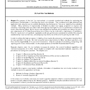 The purpose of this fuel filter test method is to provide standardized methods for evaluating the performance characteristics of fuel filters by bench test methods. This, combined with data obtained from application tests, may be used to establish standards of performance for filters when tested by these standard methods. Many variations in requirements of filtration to protect fuel supply equipment on engines and variations in operating conditions make it difficult to specify meaningful “in-service” performance standards by which a filter may be judged. By the use of these standard test methods, test conditions are always the same, and comparisons of the laboratory performance of filters may be made with a high degree of confidence. Once the requirements of a particular application are known, performance standards for suitable filters may be established by these test methods, and adequacy of performance of filters for the job may be determined.