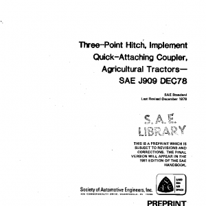This specification sets forth the dimensions for the attachment of standard three-point hitch implements or equipment to the rear of agricultural wheeled tractors equipped with a standard three-point free-link hitch and quick-attaching coupler. It does not provide for interchangeability between tractors and couplers.
