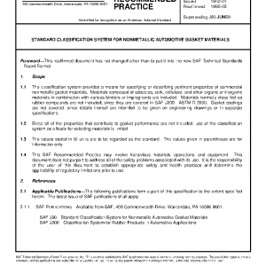 The classification system provides a means for specifying or describing pertinent properties of commercial nonmetallic gasket materials. Materials composed of asbestos, cork, cellulose, and other organic or inorganic materials in combination with various binders or impregnants are included. Materials normally classified as rubber compounds are not included, since they are covered in SAE J200—ASTM D 2000. Gasket coatings are not covered, since details thereof are intended to be given on engineering drawings or in separate specifications.