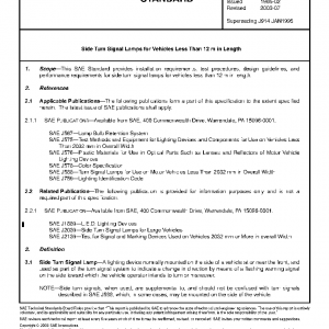 This SAE Standard provides installation requirements, test procedures, design guidelines, and performance requirements for side turn signal lamps for vehicles less than 12 m in length.