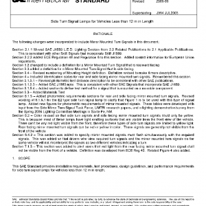 This SAE Standard provides installation requirements, test procedures, design guidelines, and performance requirements for side turn signal lamps for vehicles less than 12 m in length.