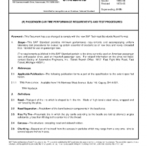 This SAE Standard provides minimum performance requirements and accompanying uniform laboratory test procedures for evaluating certain essential characteristics of new tires and newly retreaded tires intended for use on passenger cars.