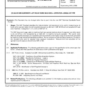 This SAE document is applicable to machines that have operator stations where the operator can either stand or sit and will be either transported by, or walk with the machine during its operation. The sound levels obtained using this procedure are repeatable and representative of the higher range of sound levels generated by machines under actual field operating conditions. Due to variability of field operating conditions, this data is not intended to be used for operator noise exposure evaluations. Measurement and calculation of the operator’s sound exposure should follow SAE J1166.