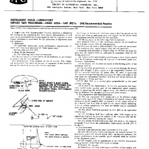 This SAE Recommended Practice describes a laboratory test procedure for evaluating the head impact characteristics of such areas of an automotive instrument panel as may be required to meet impact performance established for the protection of lap-belted front seat occupants.