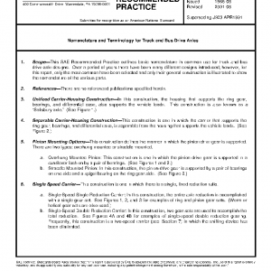 This SAE Recommended Practice outlines basic nomenclature in common use for truck and bus drive axle designs. Over a period of years there have been many different designs introduced; however, for this report, only the most common have been selected and only their general construction is illustrated to show the nomenclature of the various parts.