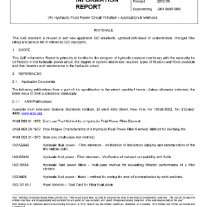This SAE Information Report is primarily to familiarize the designer of hydraulic powered machinery with the necessity for oil filtration in the hydraulic power circuit, the degree of system cleanliness required, types of filtration and filters available and their location and maintenance in the hydraulic circuit.