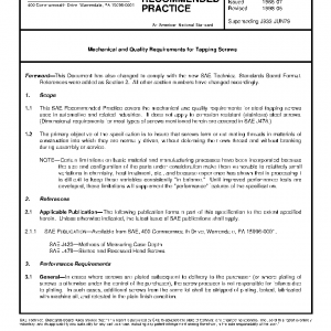 This SAE Recommended Practice covers the mechanical and quality requirements for steel tapping screws used in automotive and related industries. It does not apply to corrosion resistant (stainless) steel screws. (Dimensional requirements for most types of screws mentioned herein are covered in SAE J478.)