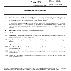 The scope of this SAE Recommended Practice is to establish recommended uniform test procedures and minimum static load requirements for vehicle passenger door hinge systems. Tests are described that can be conducted on test fixtures and equipment in laboratory test facilities.