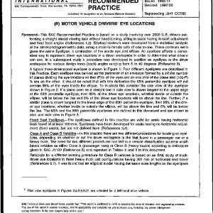 This SAE Recommended Practice establishes the location of drivers’ eyes inside a vehicle for the purpose of measuring the drivers’ field of view. Elliptical (eyellipse) models in both two and three dimensions are used to represent 95th and 99th percentiles of driver eye locations. The procedure used to locate eyellipses in passenger cars differs from the procedure used for heavy trucks. Selected eye (E) points, useful in certain viewing tasks, are derived from the 95th eyellipse. For application of this Practice refer to SAE J1050 (Reference 14).