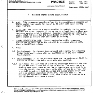 This recommended practice defines the test conditions, procedures and minimum design requirements for nominal 6, 12 and 24 volt hazard warning signal flashers.