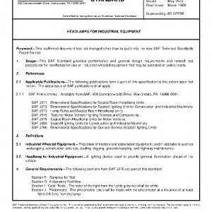 This SAE Standard provides performance and general design requirements and related test procedures for headlamps for use on industrial wheeled equipment that may be operated on public roads.