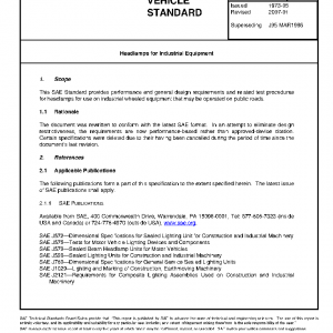 This SAE Standard provides performance and general design requirements and related test procedures for headlamps for use on industrial wheeled equipment that may be operated on public roads.