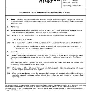 This SAE Recommended Practice describes methods for determining total and specular reflectance for mirrors with flat and curved surfaces and a method for determining diffuse reflectance and haze for mirrors with flat surfaces.