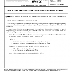 This part of SAE J968 specifies two types of calibrating nozzle and holder assemblies intended for the testing and setting of diesel injection pumps on test benches.